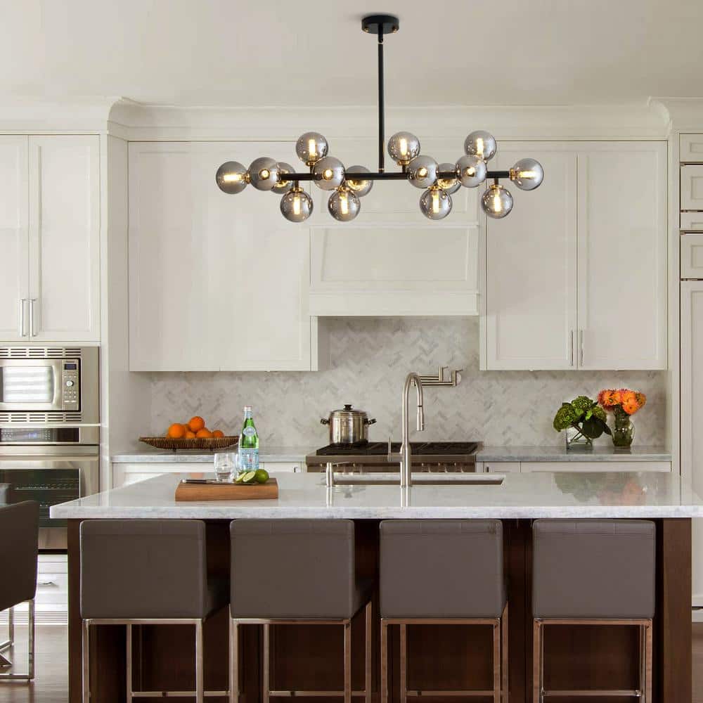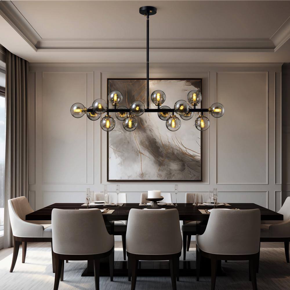 Featuring an elegant linear metal frame finish, this 16-light sputnik chandelier is both neutral and decorative. With gray glass globe lampshades and a spoke layout of the arms, it is particularly well-suited above a rectangular or round dining table or in a contemporary kitchen. The transparent glass allows the warm light to shine through, providing ample illumination. This design is perfect for a minimalist or modern kitchen, dining area, or living space, offering both functionality and a stylish statement piece.