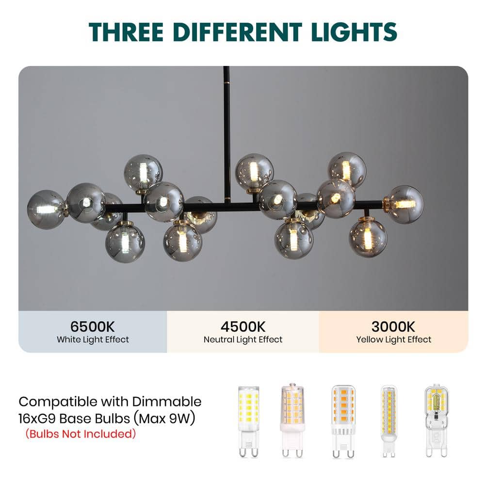 - Light source: 16 x G9 bulbs, max 7W each (bulbs not included) Voltage: 110-220V (worldwide compatible)